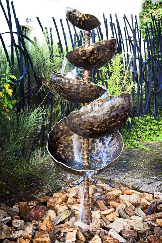 Het trapsgewijs stromende water zorgt voor beweging en geluid, terwijl de organische vormen en het warme brons een tijdloos karakter geven. De waterbron vormt een echte blikvanger en past zowel in een natuurlijke als architectonische omgeving.