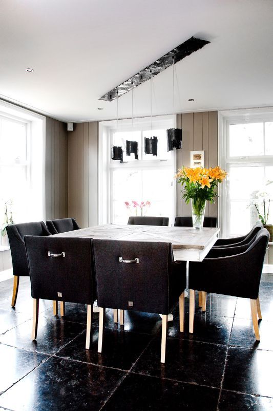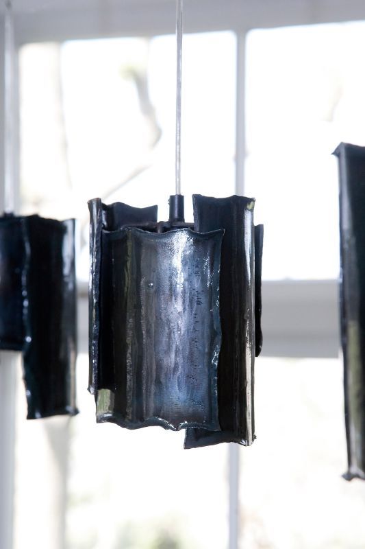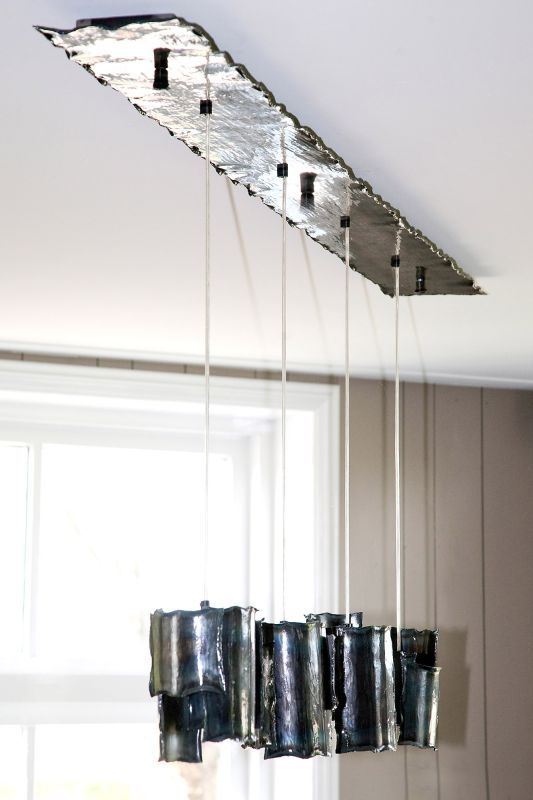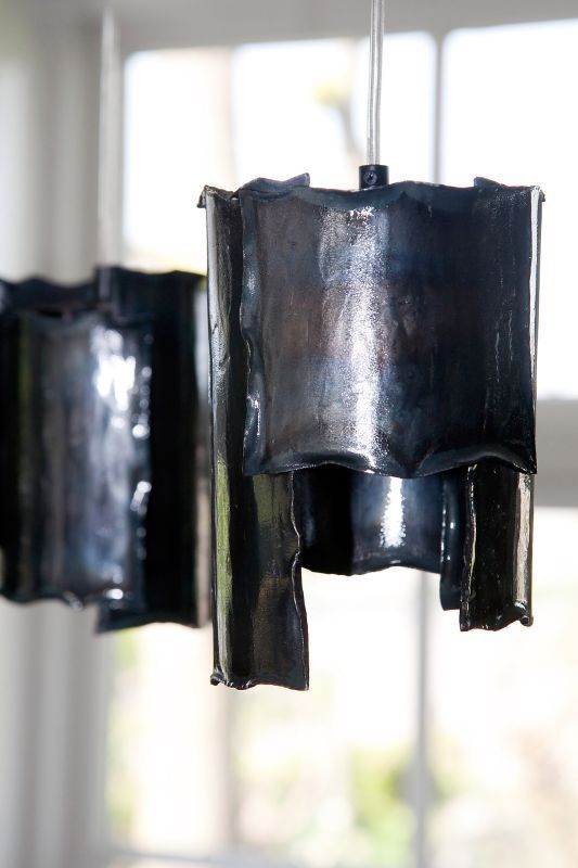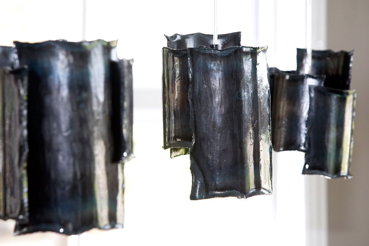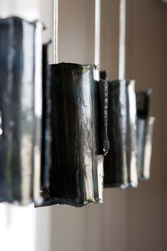 De lamp vormt een kunstzinnig object dat zowel functioneel als decoratief is. Door het contrast tussen de strakke pendels en de expressieve, handgevormde kappen ontstaat een krachtig geheel dat perfect aansluit bij het eigentijdse interieur van de woning.