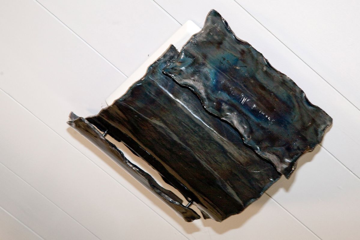 - Een handgesmede plafondplaat met een organisch, golvend oppervlak en een subtiel gehamerd reliëf,