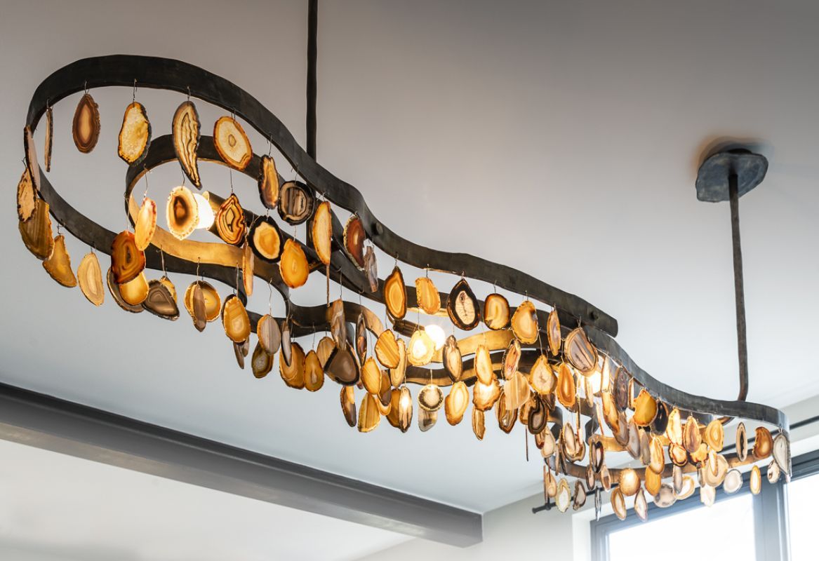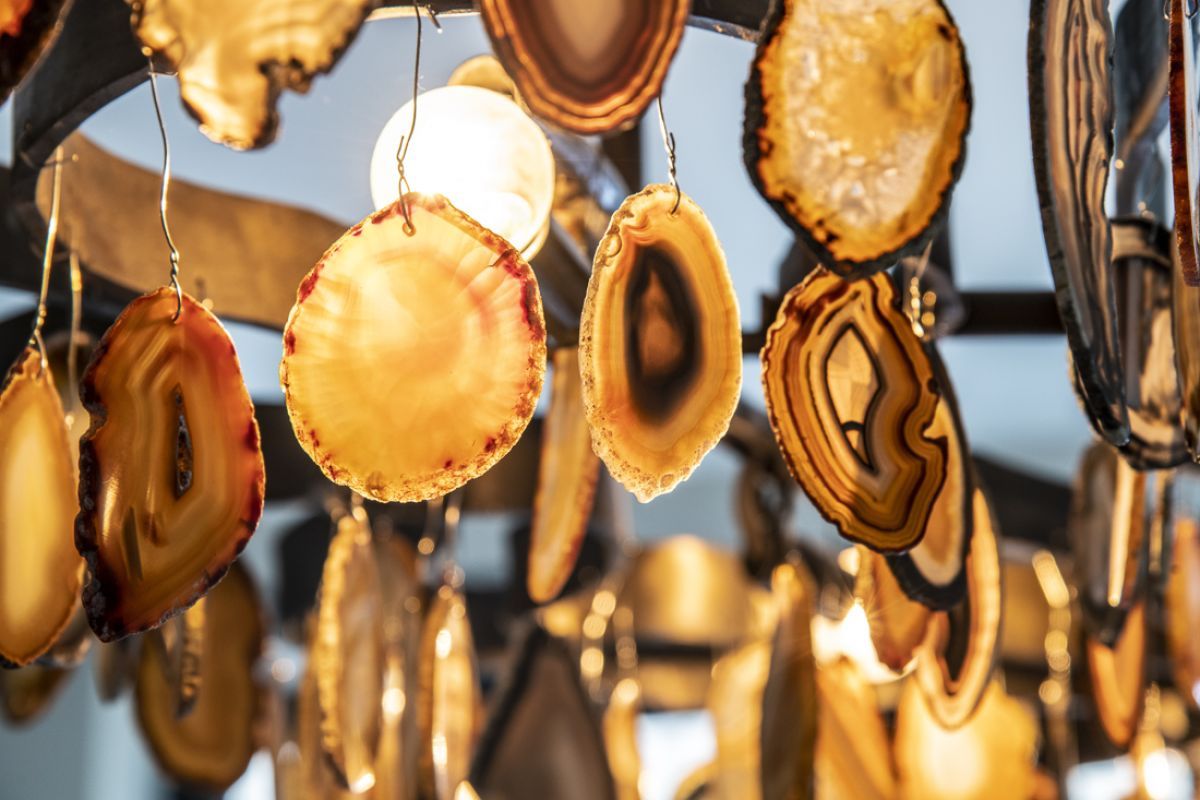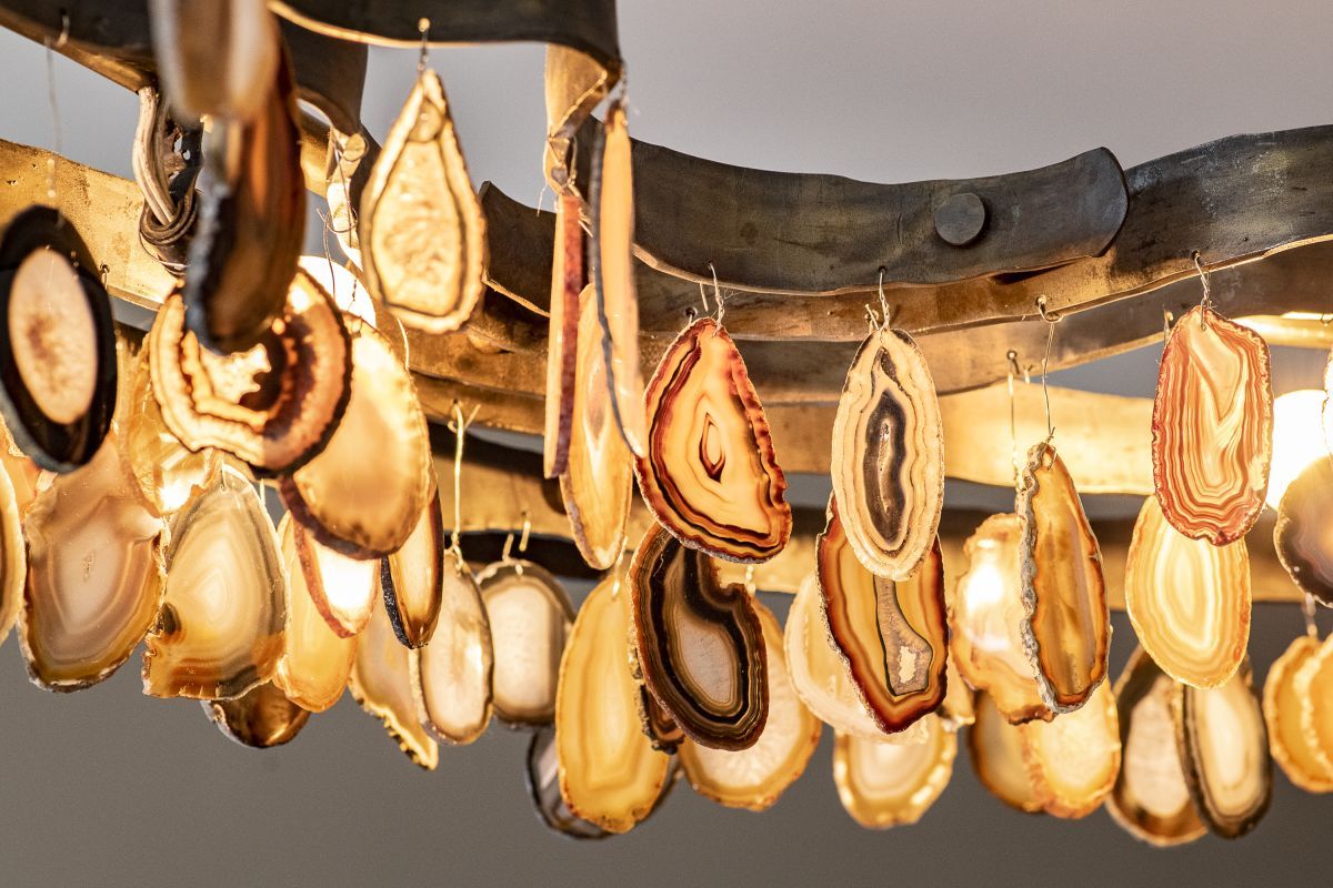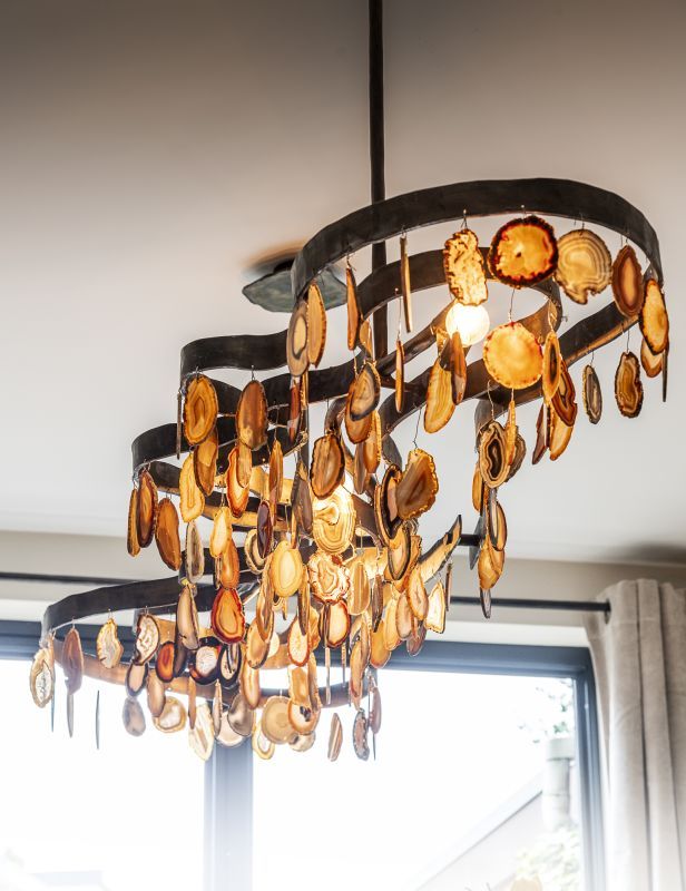 - Een speelse gelaagdheid, waarbij het licht door de half-transparante agaatstenen wordt gefilterd en een warme, bijna magische sfeer creëert,