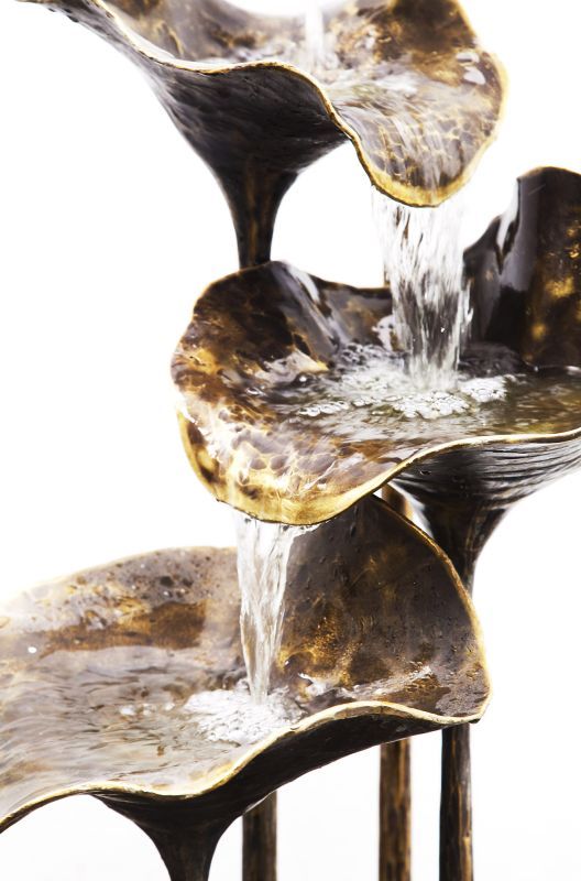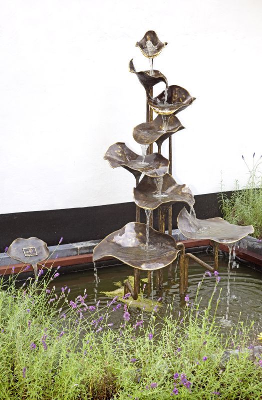 - Slanke, handgesmede staanders die de waterbron luchtig en sculpturaal laten ogen,