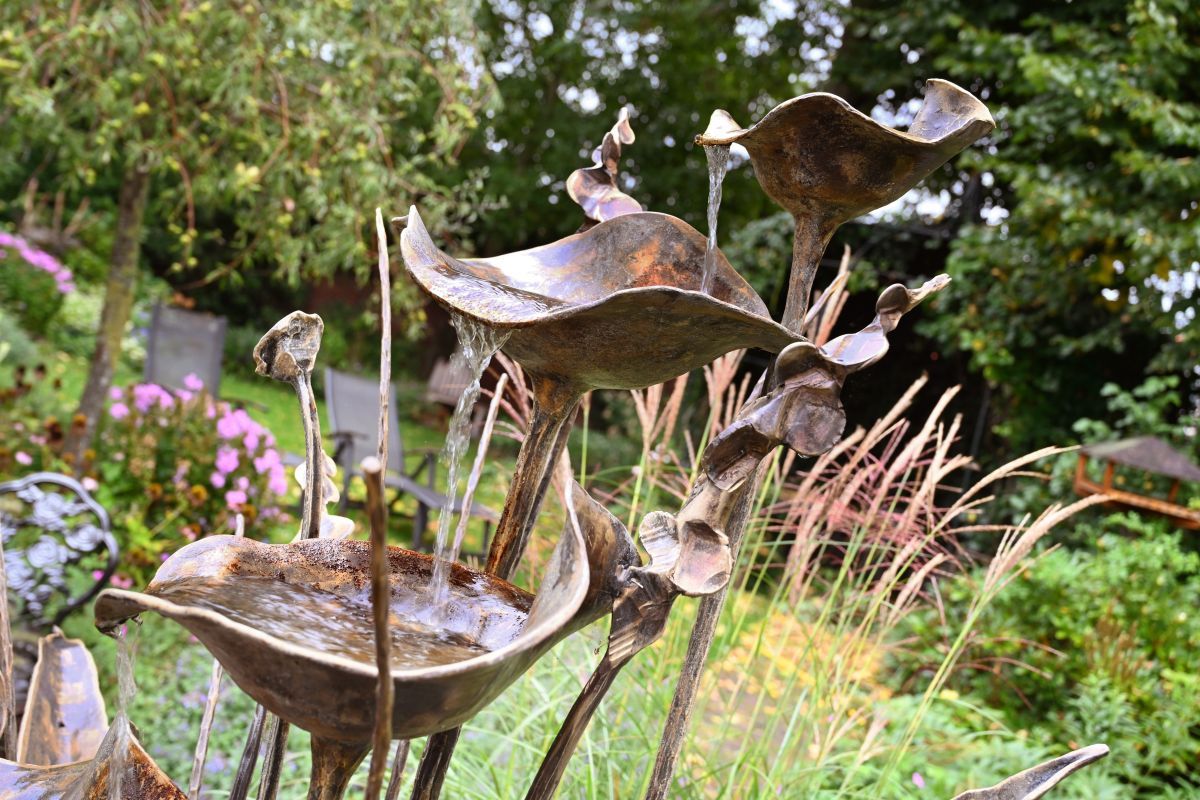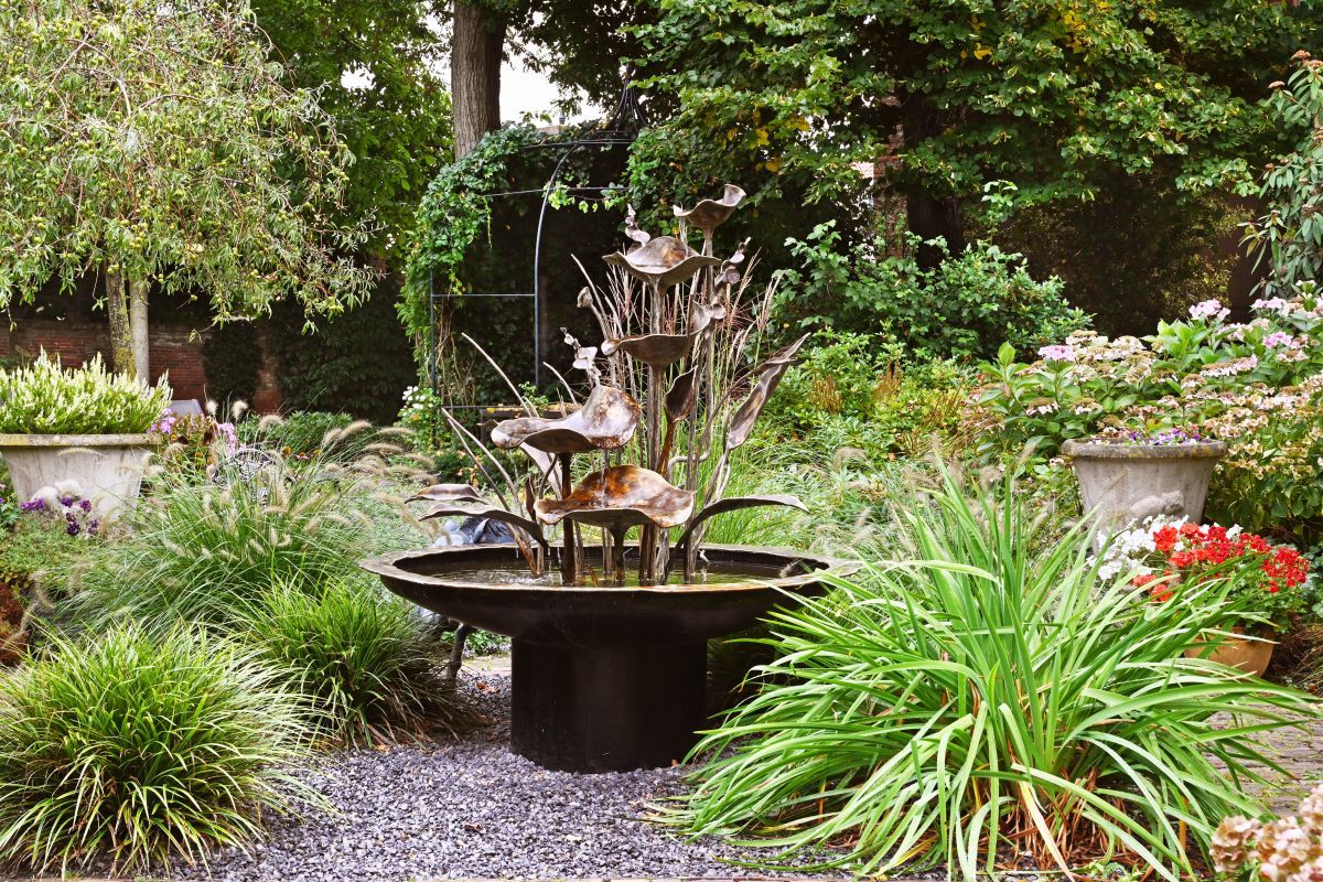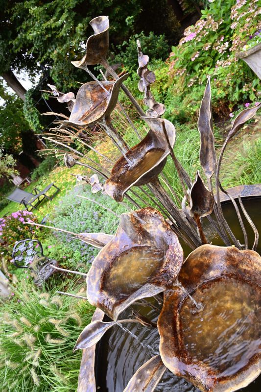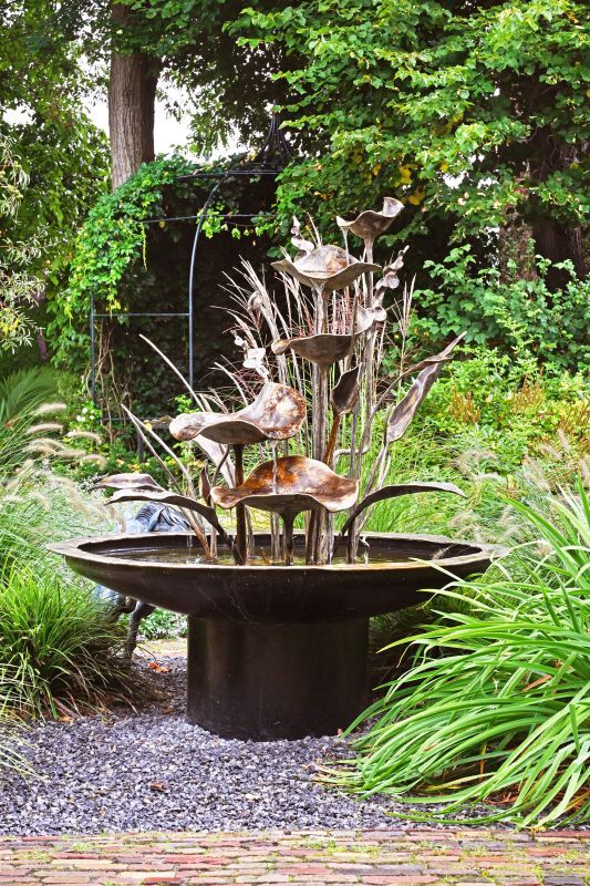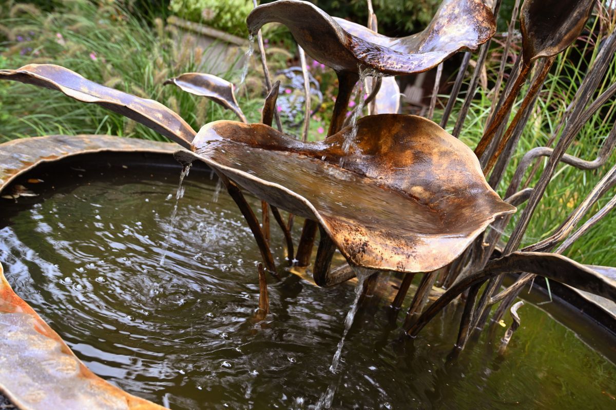 De combinatie van ambachtelijk smeedwerk, organische lijnen en de zachte waterbeweging maakt dit werk tot een rustgevend middelpunt in de tuin.