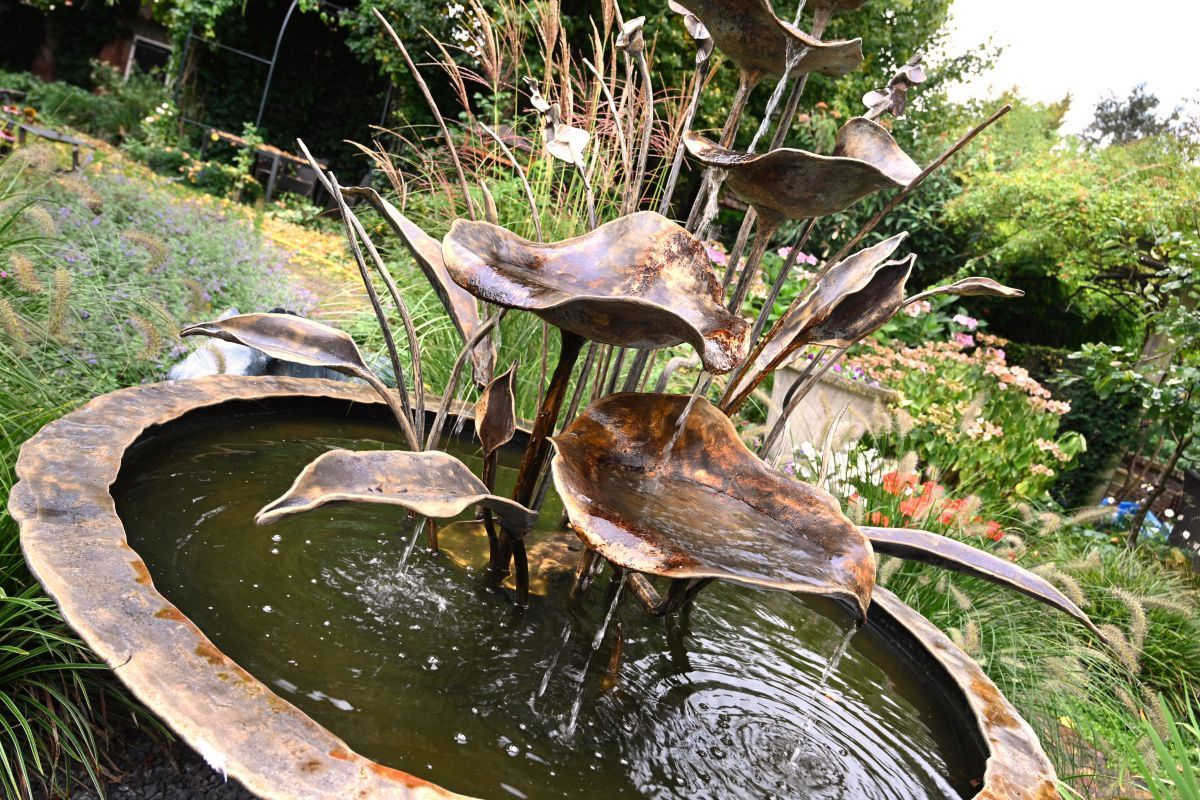 In een weelderige tuin in Harderwijk realiseerden wij deze royale waterbron, opgebouwd uit een bundel handgesmede bladvormen die samen een kunstzinnige, natuurlijke waterbeweging creëren. Het geheel is geplaatst in een grote stalen schaal, waardoor het object een monumentale, maar toch organische uitstraling krijgt.