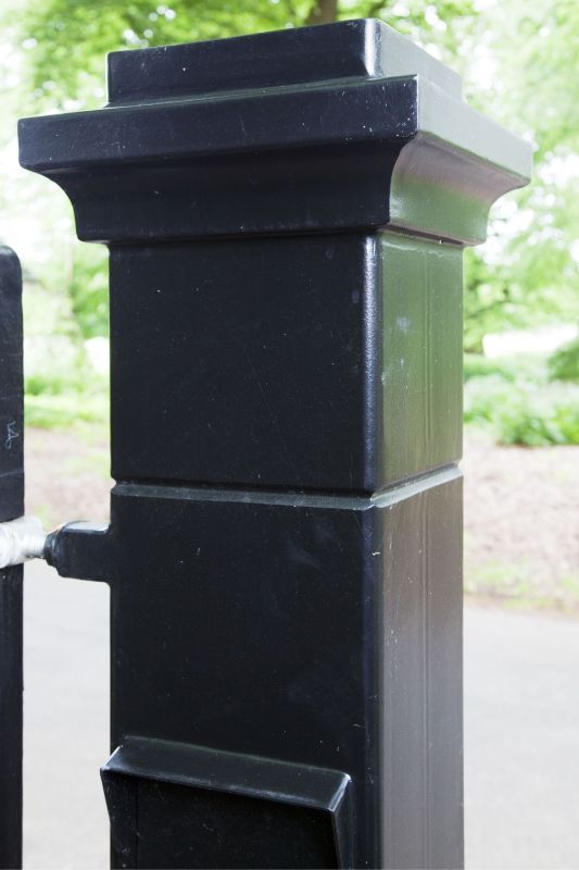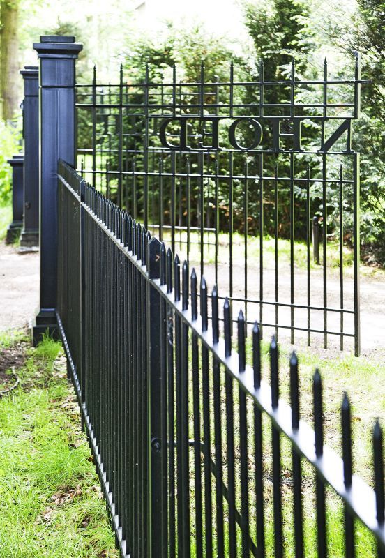 - Een rechte, klassieke poort voorzien van verticale stijlen en subtiele speerpunten,