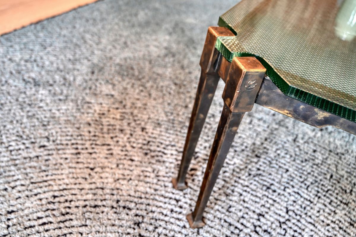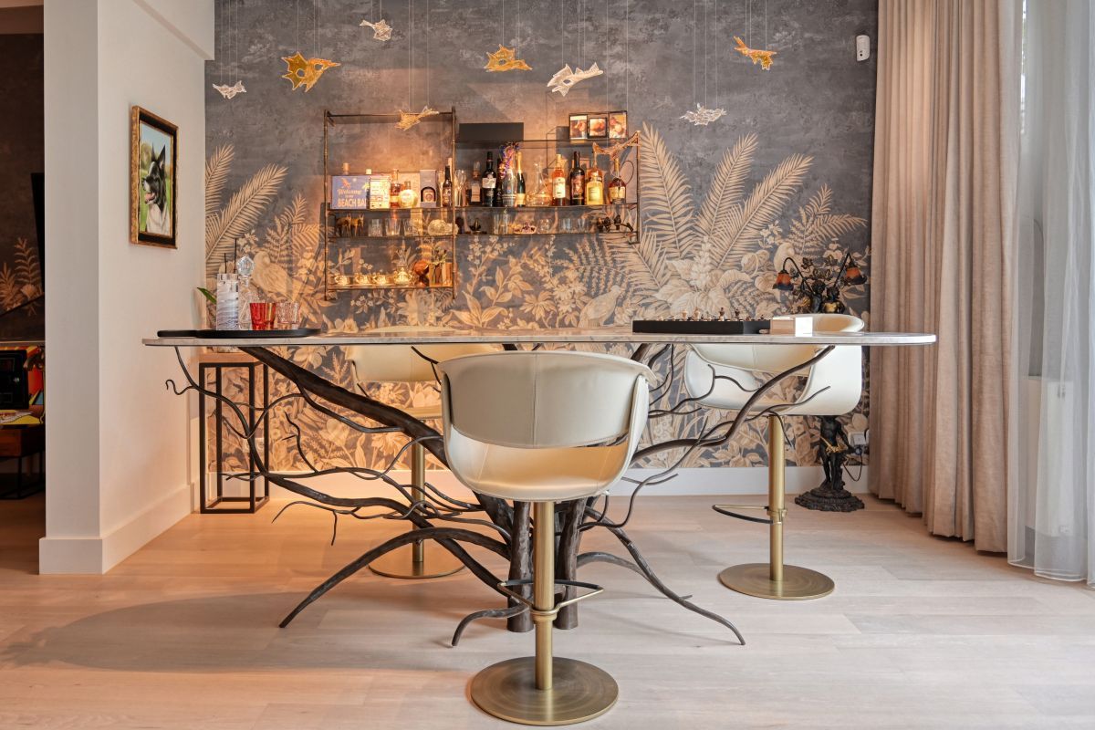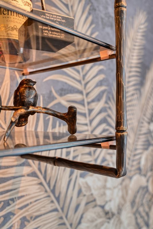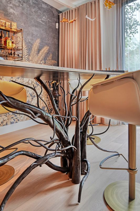 - Een bartafel met gesmede stalen takken als sculpturaal onderstel,