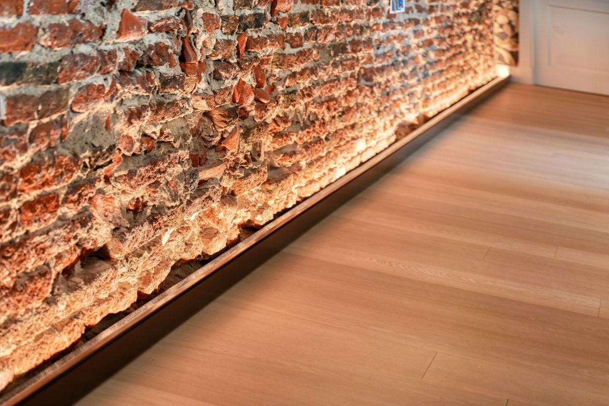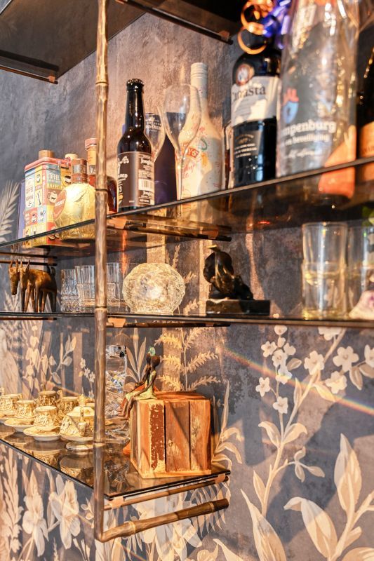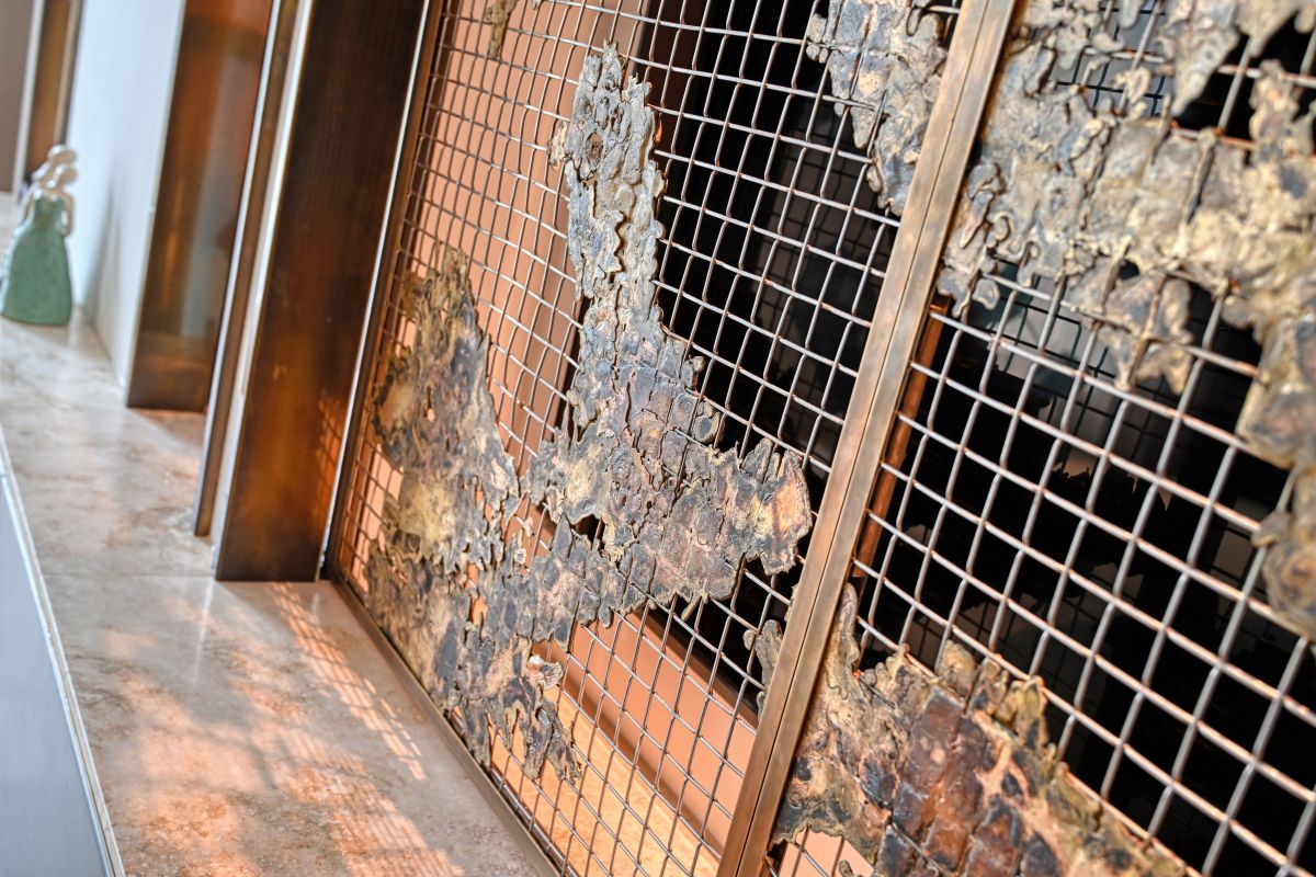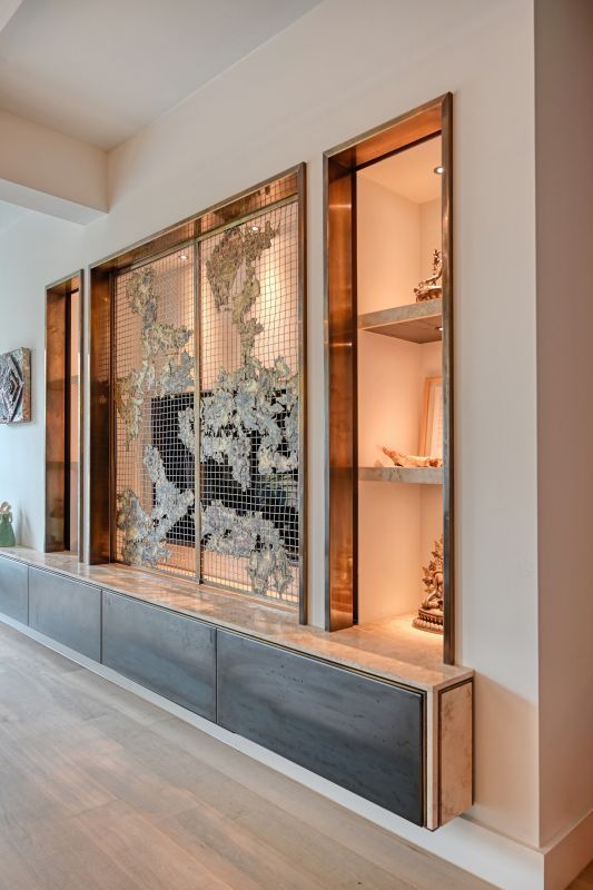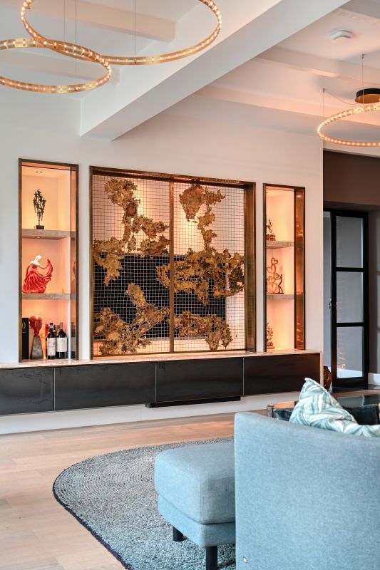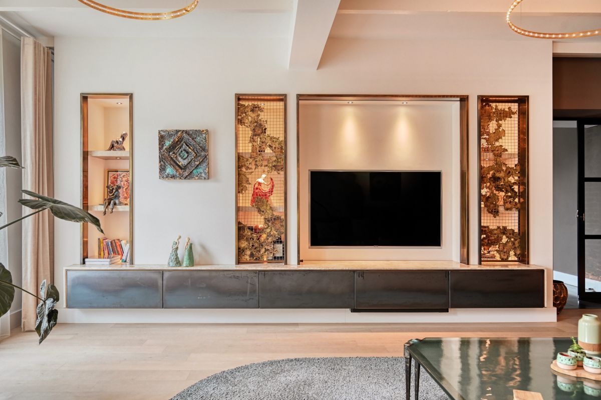 - Een maatwerk tv-meubel met elektrische messing schuifdeuren voorzien van een gegoten patroon,