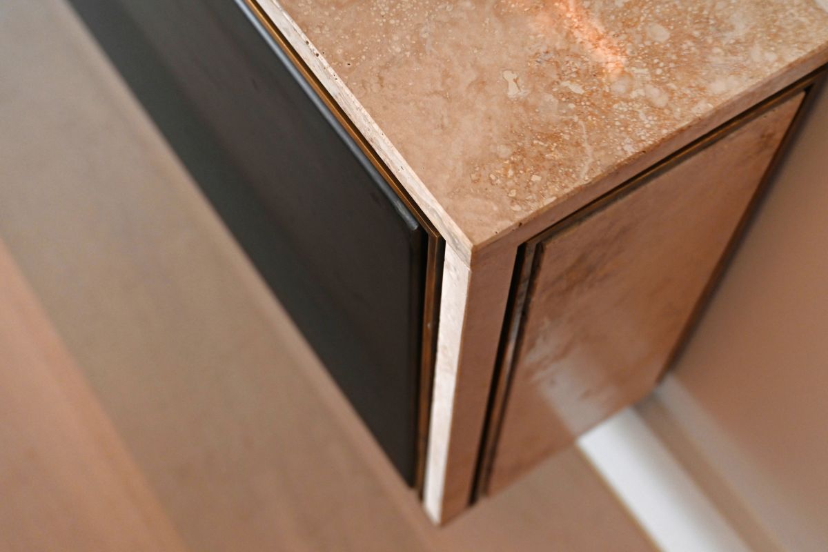 - Travertin natuursteen gecombineerd met strak uitgevoerde maatwerkkasten,