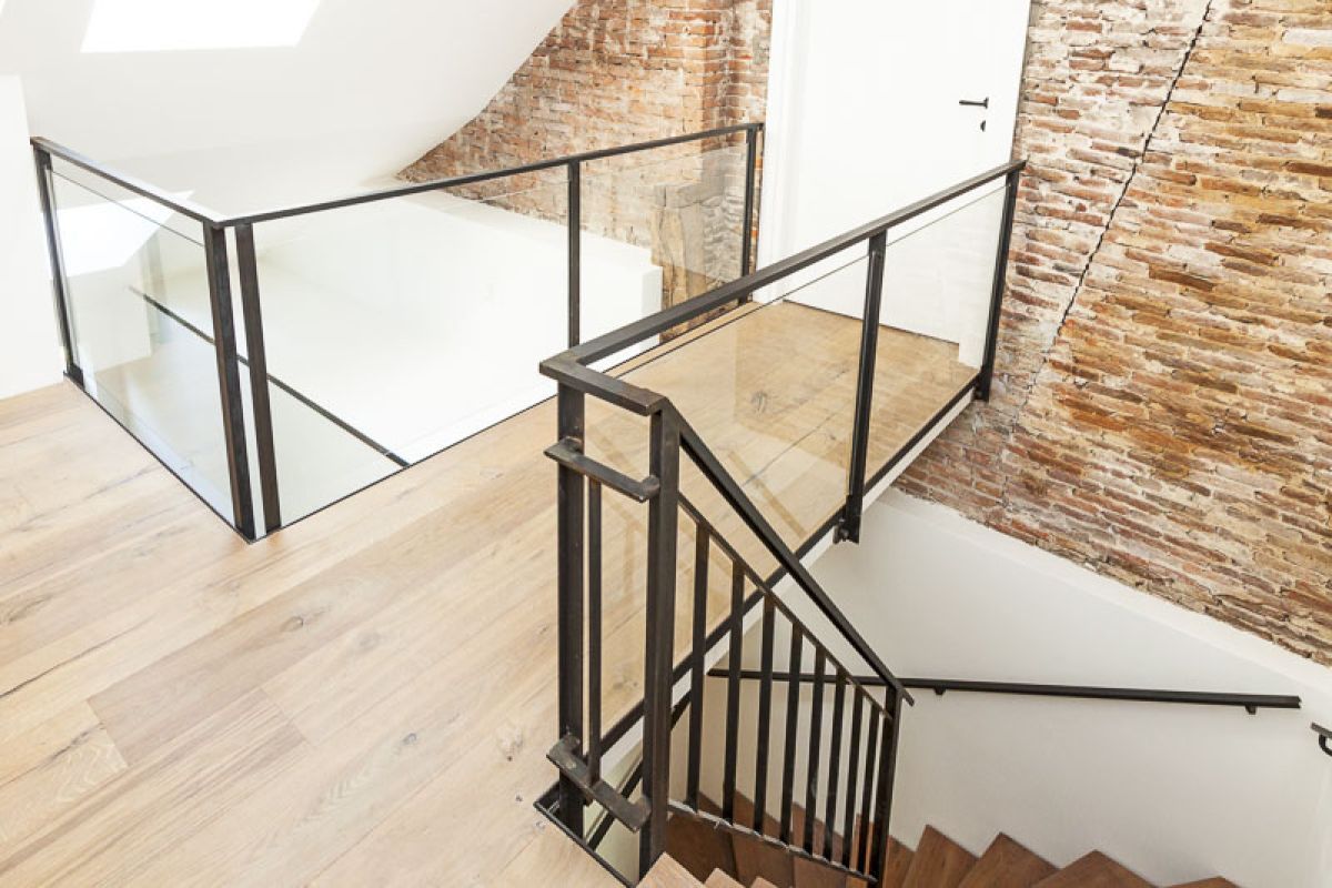De combinatie van glas, staal en hout zorgt voor een harmonie tussen modern design en ambachtelijk vakmanschap. Deze maatwerkelementen dragen bij aan een veilige, elegante en duurzame afwerking van het interieur.