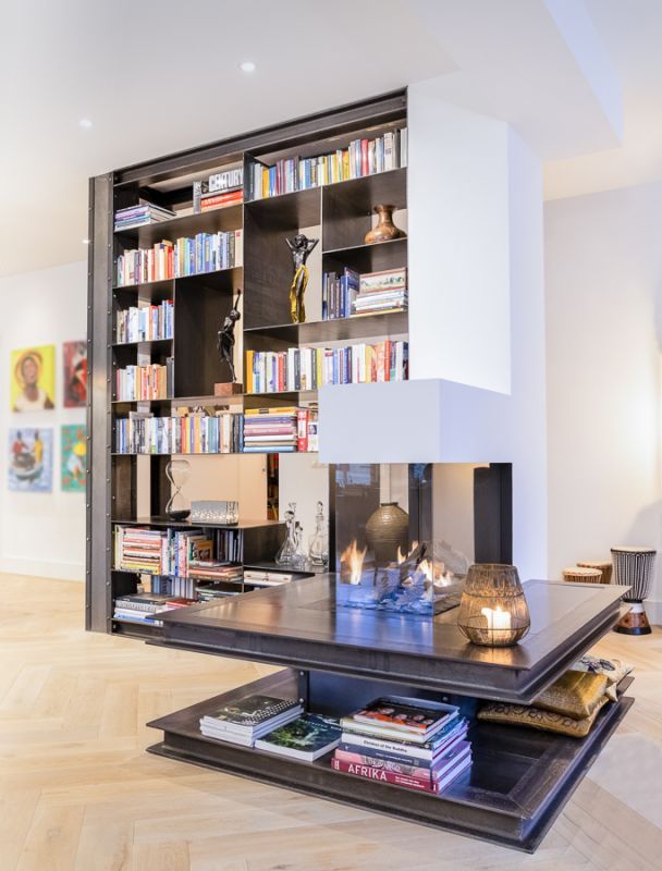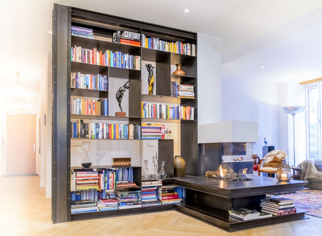 Modern en stijlvolle stalen boekenkast en haard