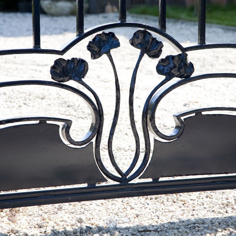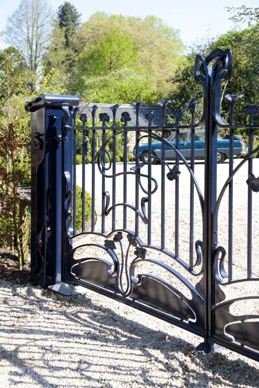 De diepzwarte afwerking, in combinatie met de vloeiende lijnen en verfijnde ornamentiek, geeft deze poort een luxe en traditioneel karakter dat perfect past bij de landelijke omgeving.