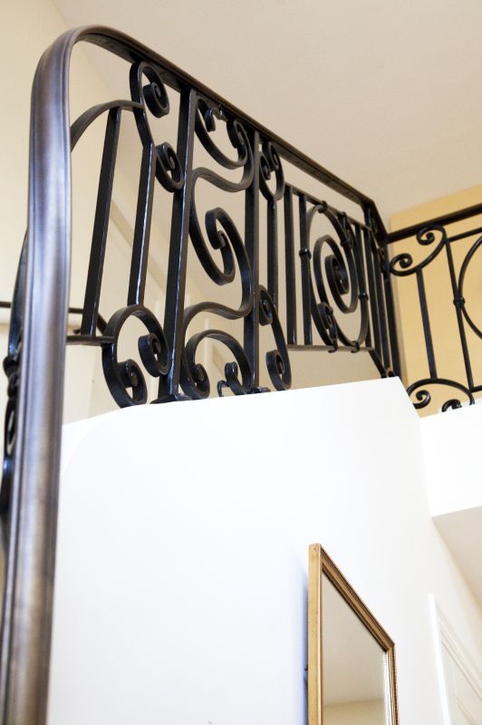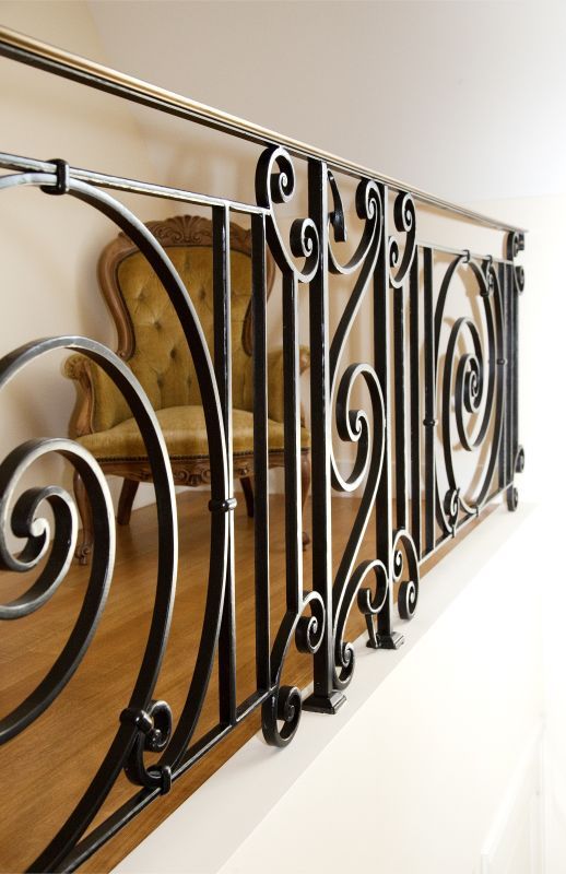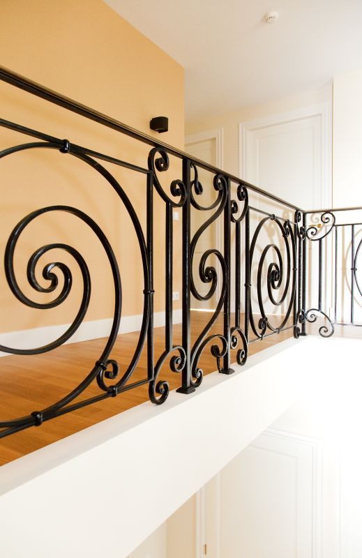 - Een doorlopende smeedijzeren trapleuning met vloeiende, ambachtelijk gesmede krul- en spiraalvormen,