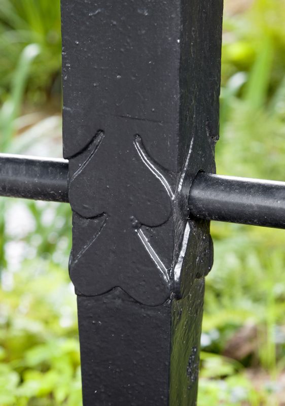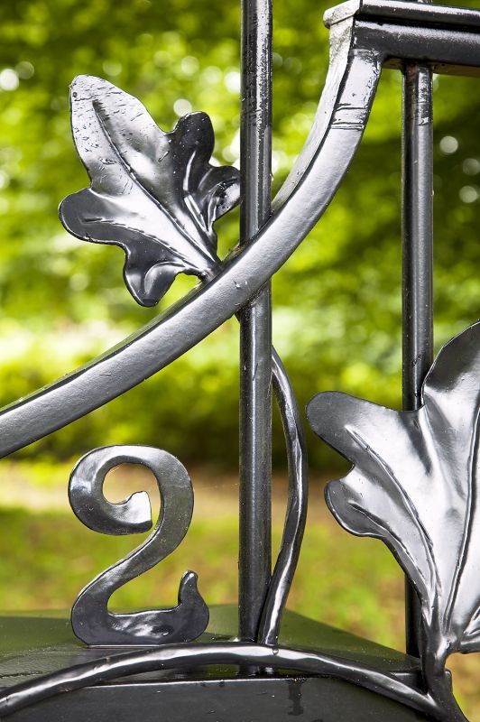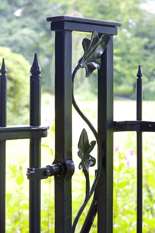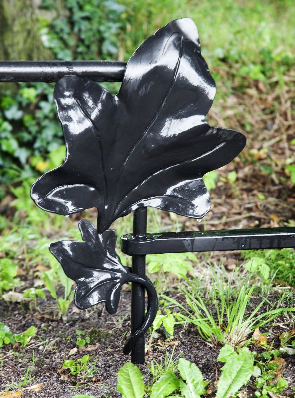 - Ambachtelijk handgesmede eikenbladeren die langs het hekwerk zijn aangebracht en die de natuurlijke omgeving weerspiegelen,
