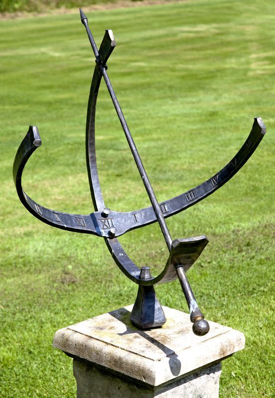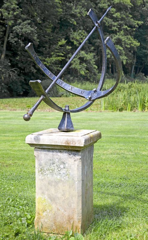 - Een kunstzinnige zonnewijzer, met de hand gesmeed uit staal, voorzien van Romeinse cijfers en geplaatst op een natuurstenen sokkel.