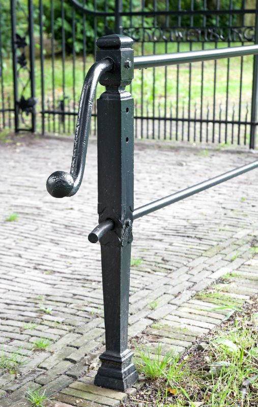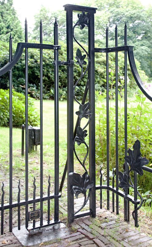 - Een sierlijk toegangshek met een klassieke, gebogen bovenlijn en verticale spijlen,