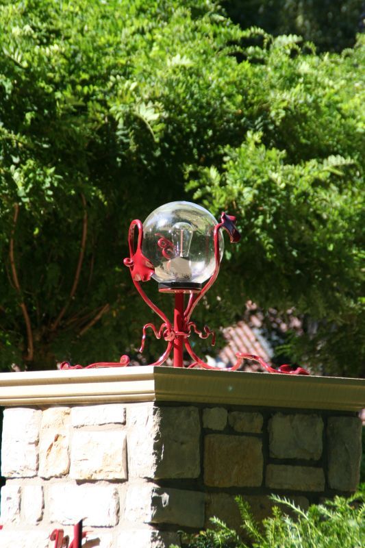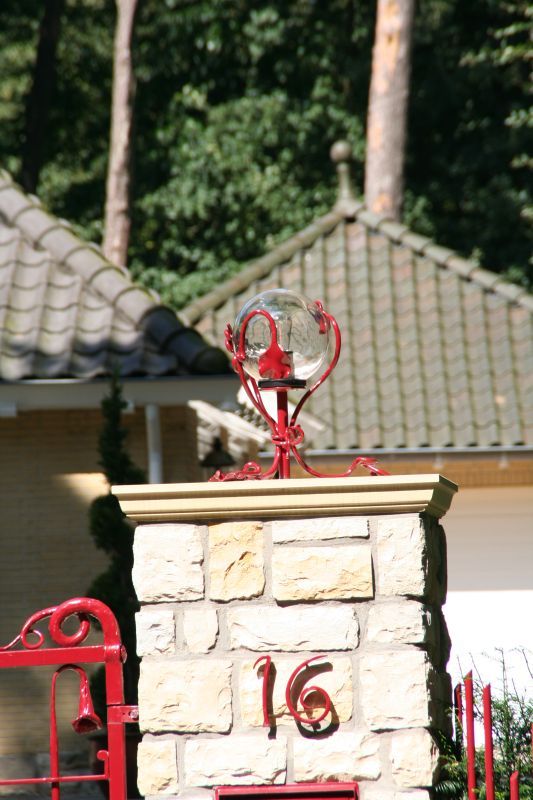 - Ambachtelijk vervaardigde lantaarns op de zuilen, waarbij gesmede elementen een glazen bol dragen,