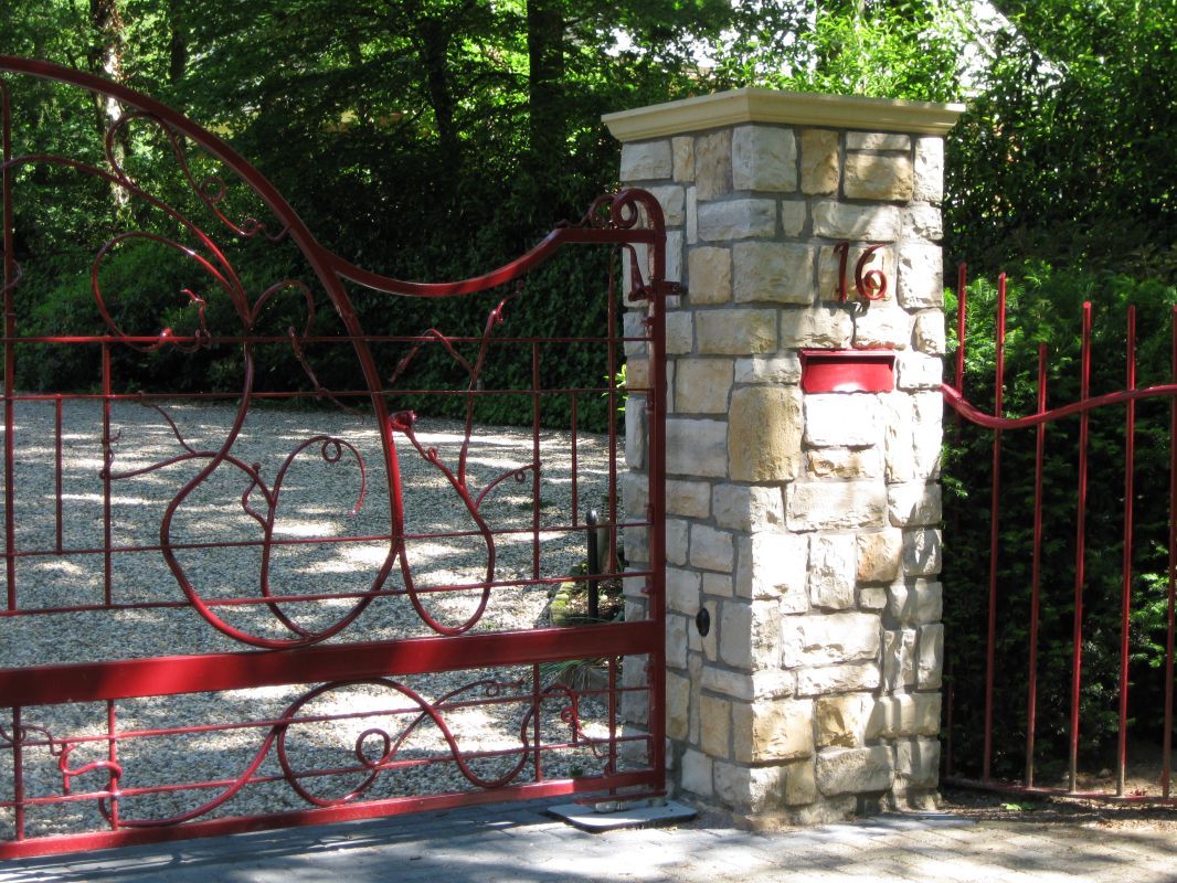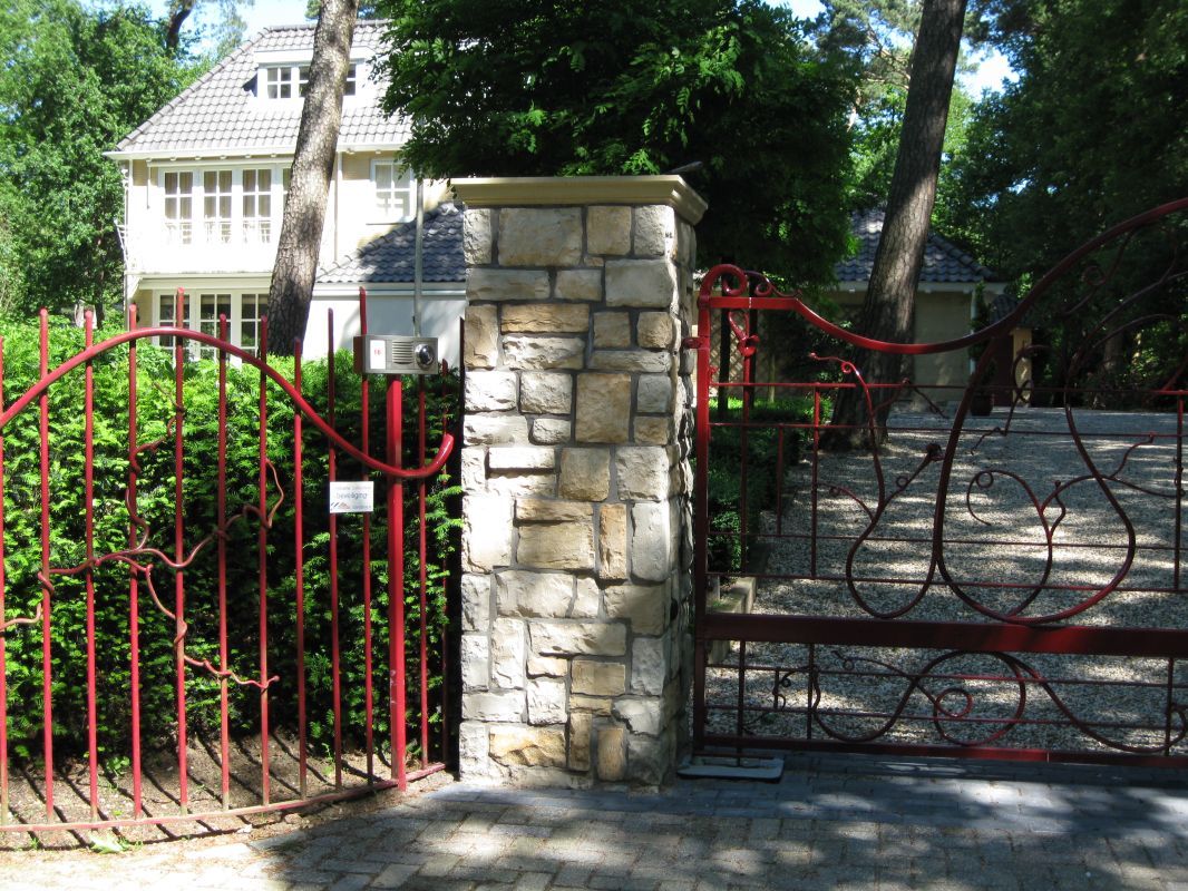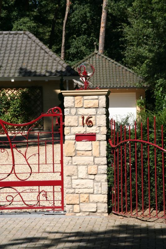 - Robuuste natuurstenen zuilen waarin huisnummer en brievenbus subtiel zijn verwerkt,