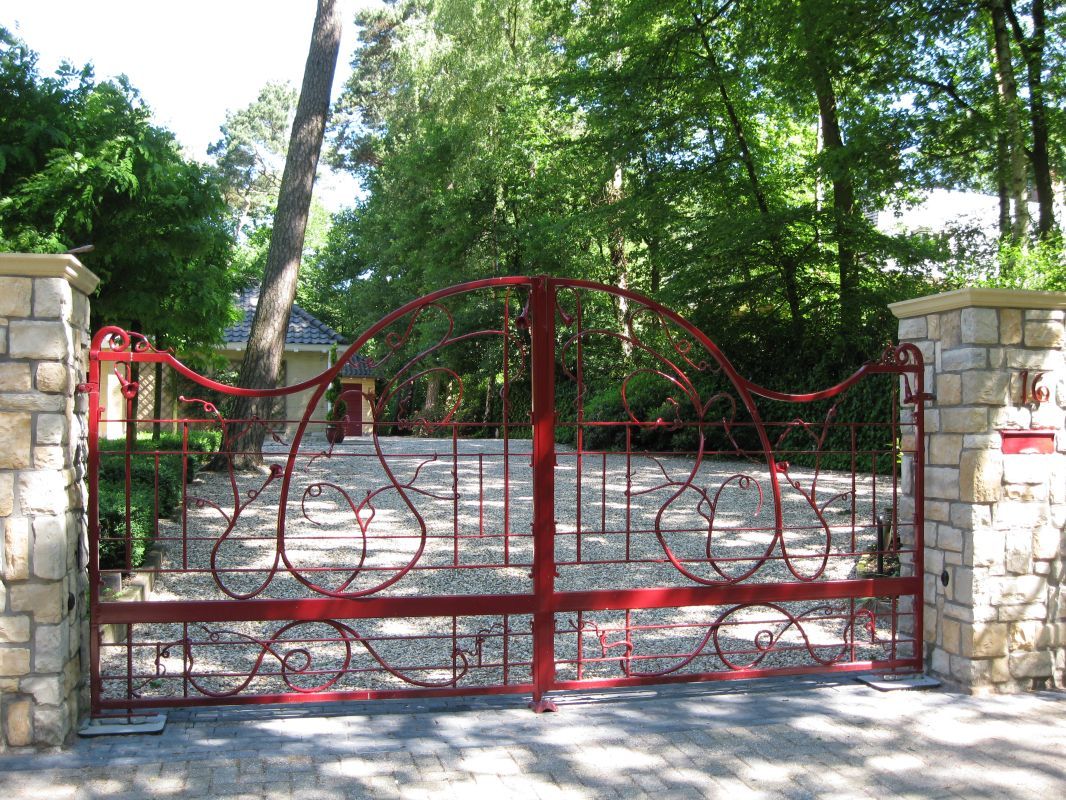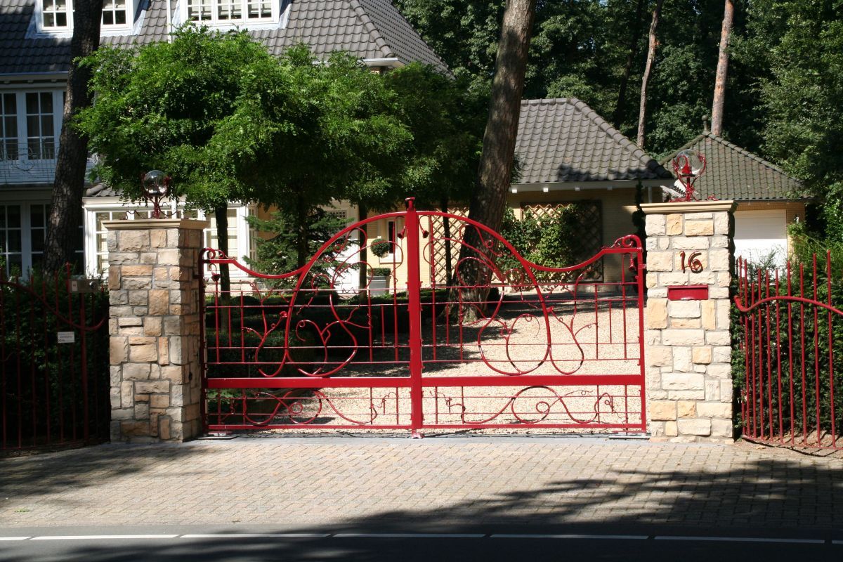 Voor een karakteristieke villa in Blaricum realiseerden wij een opvallende en volledig met de hand vervaardigde toegangspoort. Het ontwerp valt direct op door zijn elegante, rode kleurstelling en ambachtelijke details.
