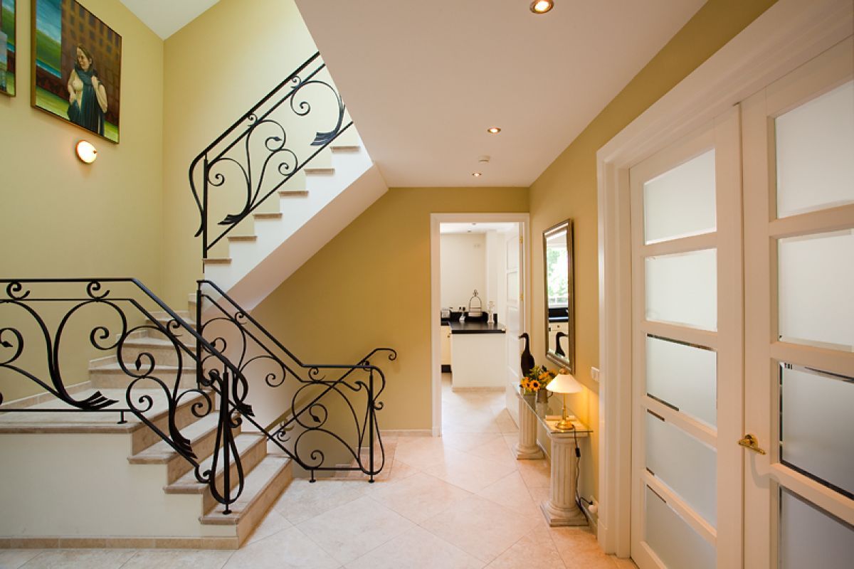 De combinatie van warme materialen, ambachtelijk smeedwerk en het open karakter van de hal resulteert in een uitnodigende entree met een luxe en tijdloze uitstraling.