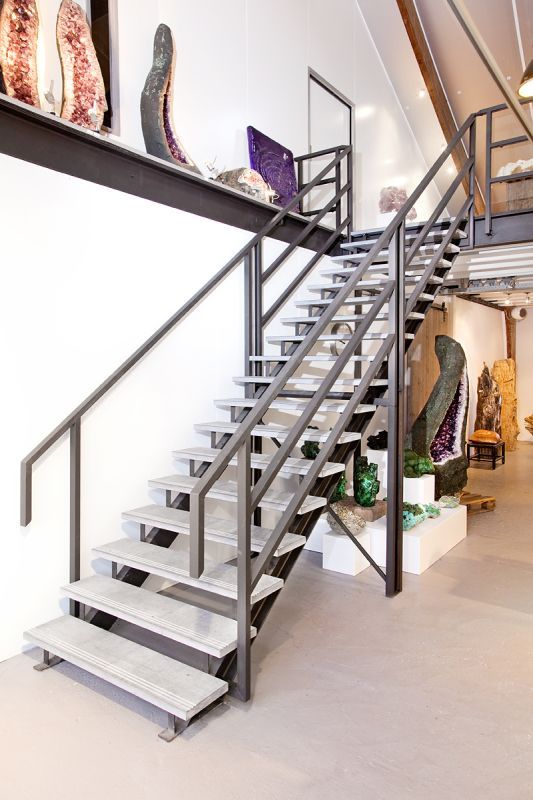 - Een open stalen steektrap met houten treden, gedragen door een minimalistisch, maar krachtig stalen frame,