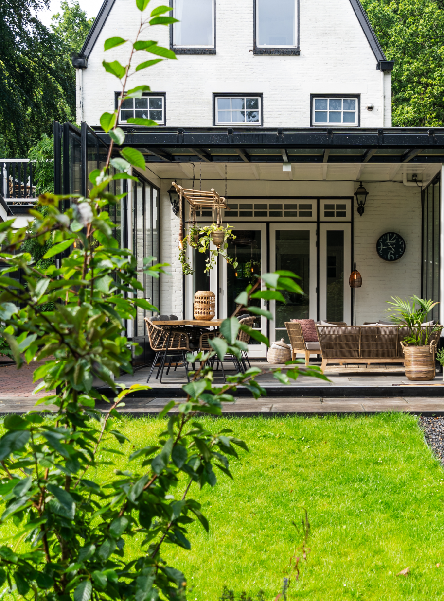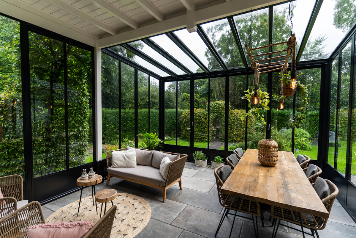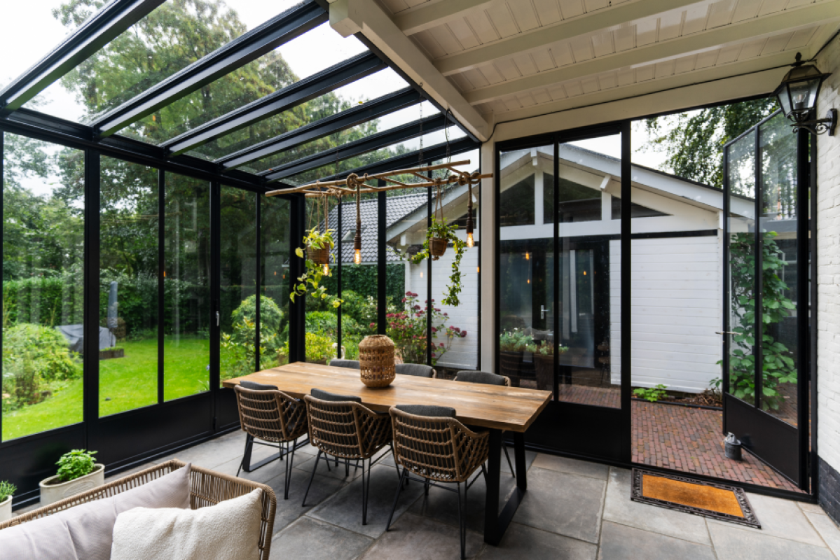 Het glazen dak van de veranda laat daglicht diep de ruimte binnen en biedt tegelijkertijd bescherming tegen regen en wind. Hierdoor ontstaat een comfortabele plek die het hele jaar door gebruikt kan worden.