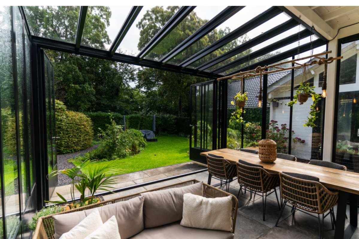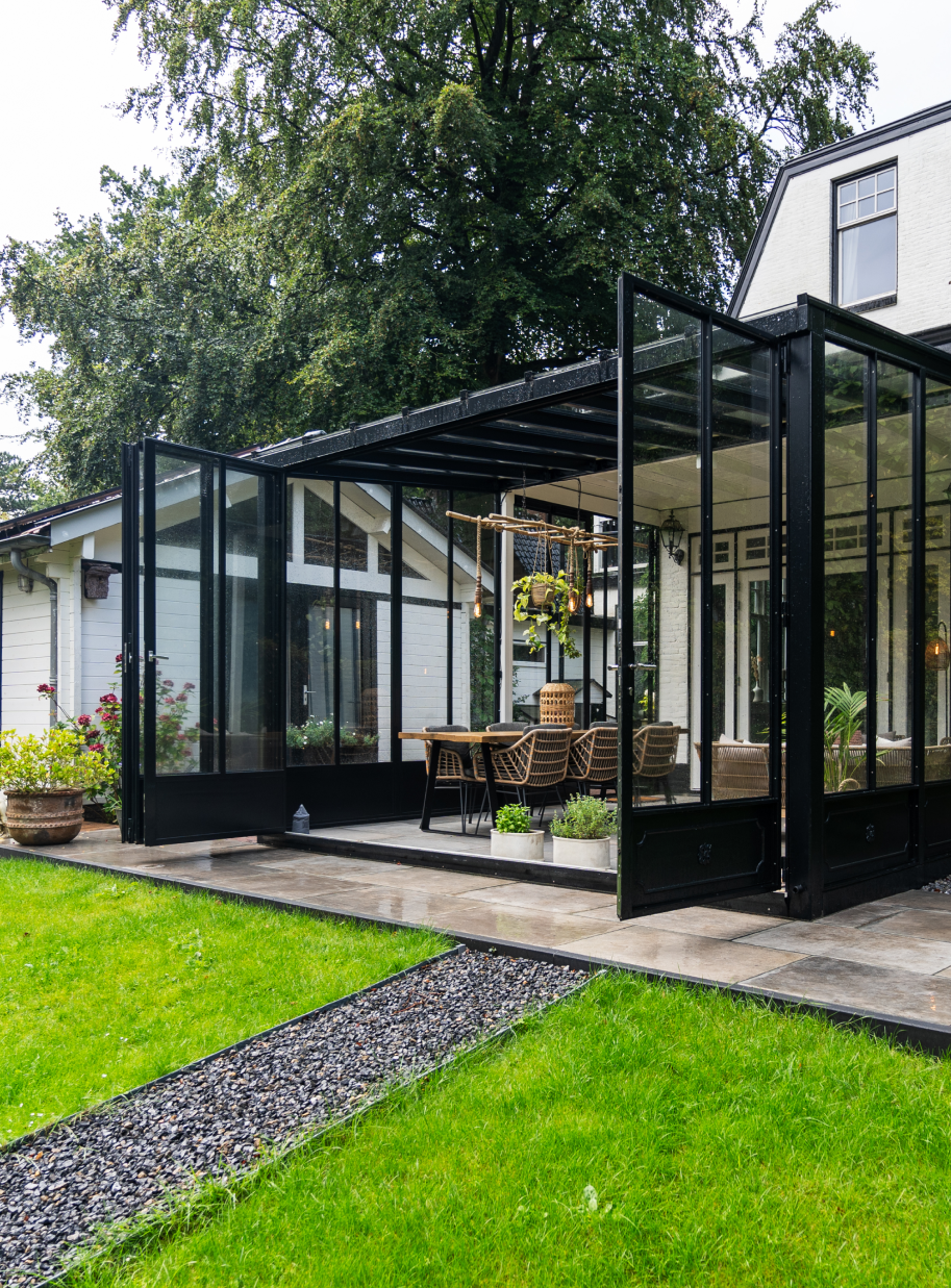 Een stalen veranda op maat met glazen dak en harmonica pui is dé manier om uw woning te verrijken met extra leefruimte, licht en comfort.