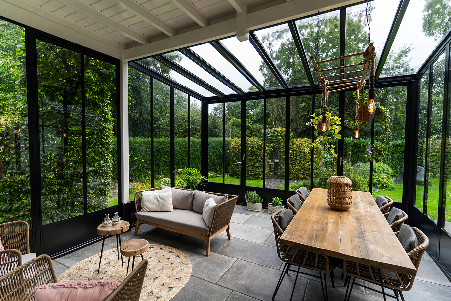 Stalen veranda met glazen dak – licht, strak en duurzaam