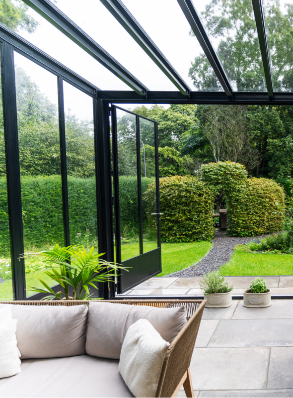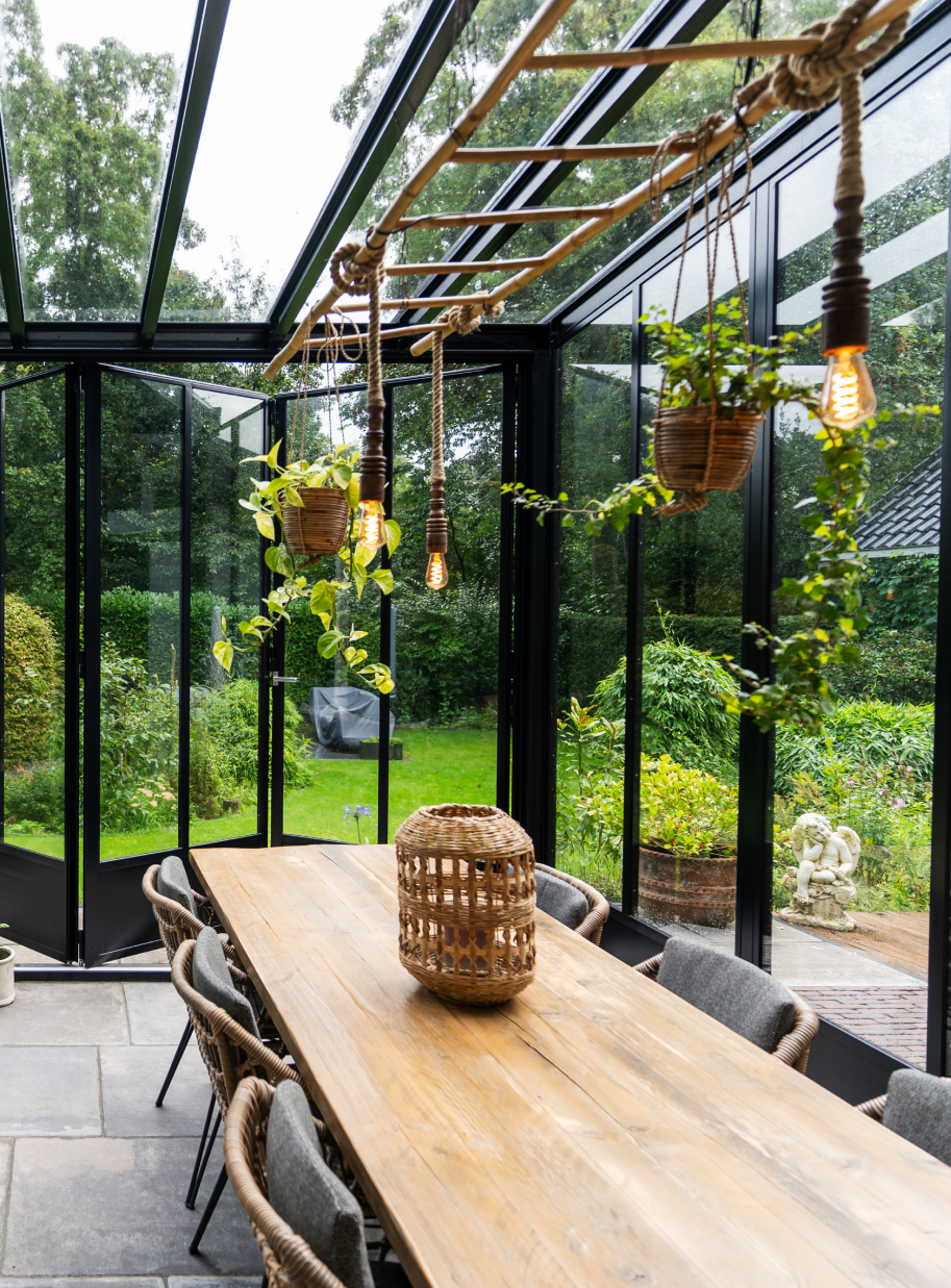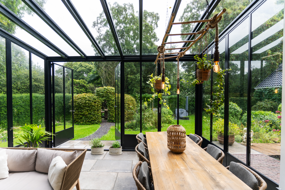 Deze veranda functioneert als een volwaardige tuinkamer van staal en glas. Een plek waar comfort en buitenbeleving samenkomen.