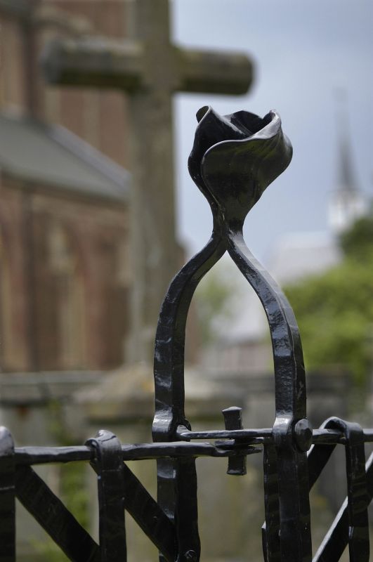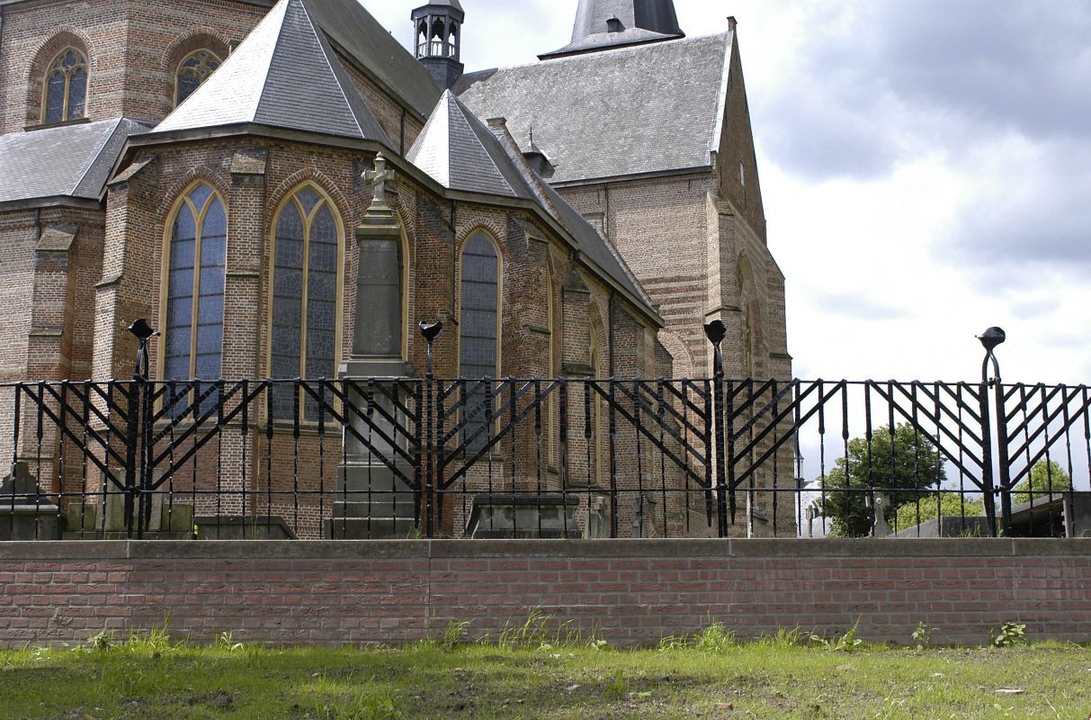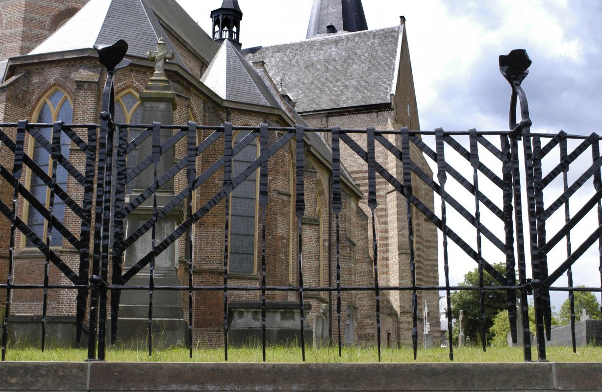 Het lijnenspel van het hekwerk sluit harmonieus aan bij de architectuur van de kerk en de omliggende monumentale elementen. De combinatie van traditioneel smeedwerk en eigentijdse vormtaal zorgt voor een waardige, duurzame afbakening van het terrein.